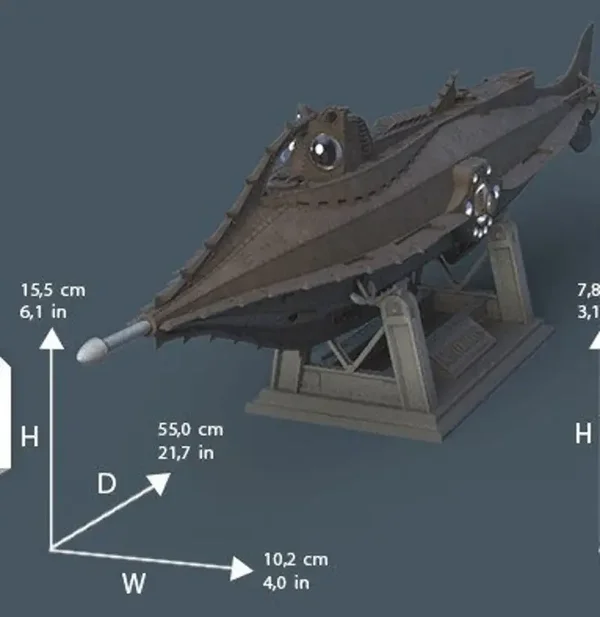 Dieses 3D-gedruckte Modell fängt den Geist von Kapitän Nemos legendärem U-Boot aus 20.000 Letters unter dem Meer ein. Das für Sammler und Fans der klassischen Science-Fiction entworfene Stück verbindet Steampunk-Ästhetik mit maritimer Fantasie.