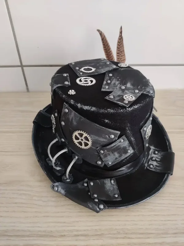 Der Hut hat eine Filzbasis und kann in verschiedenen Ausführungen bemalt werden. Federn, Phiolen, Draht und Zahnräder machen den Hut zu einem einzigartigen Schmuckstück, der Dein Steampunk Kostüm perfekt ergänzt. Ich fertige jeden Hut per Hand und als Einzelstück an. Beispielhafte Ausführungen sind in den Bildern hinterlegt. Gerne berücksichtigen wir Eure Wünsche bei der Anfertigung des Hutes.